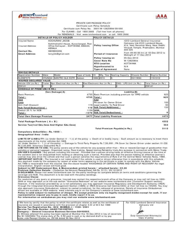 Car Insurance Policy Icici Lombard Car Insurance Policy Copy